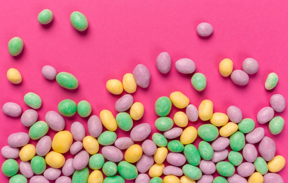 Colored, different sweets, lollipops, marshmallows, caramel popcorn on a pink background. Copy space. Top view, sweets concept