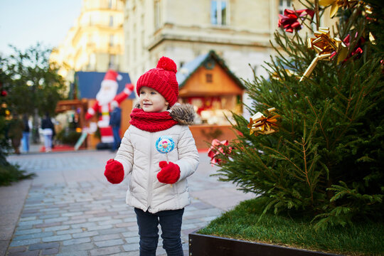 Happy cheerful preschooler girl on a Christmas market in Paris, France