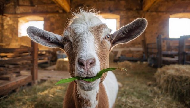 Curious brown-and-white goat nibbling green blade of grass in rustic barn interior