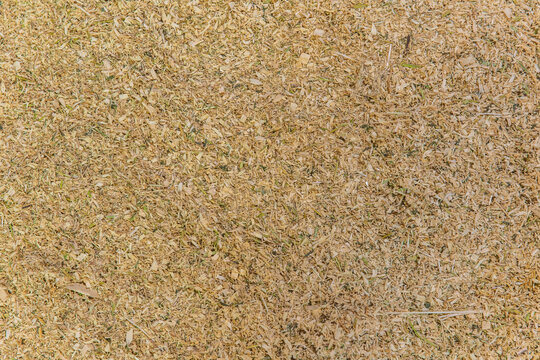 High resolution surface detail of straw and wood shavings on barn floor showing natural organic texture and golden tones used for livestock bedding