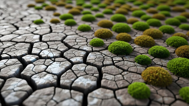 Close up image of dry cracked ground texture with green and brown moss growing. A pattern of regeneration on barren land. New life emerging.