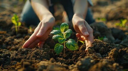 Young girl's hands planting seedlings in waste land, concept seedling of hope