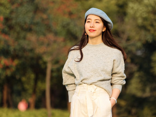 Portrait of beautiful Chinese young woman in woolen sweater and blue beret smiling with hands in pocket, charming Chinese girl with black long hair enjoy her leisure time outdoor.