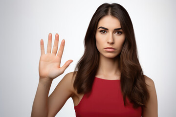 Woman Shows Stop Sign With Her Hand On White Background