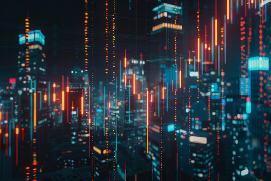 Dynamic financial data graphic displays increasing investment trends. Digital chart illustrates surging stock market performance. Information visualized as abstract graph with growing bars, lines.