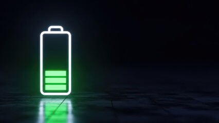 Neon green low battery icon with glowing bars floating on a dark background reflecting on a polished floor