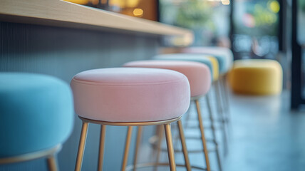 Colorful barstools in a modern cafe setting.