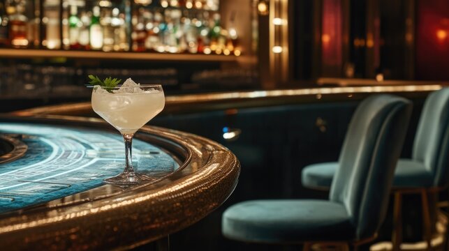 serene view of cocktail served at elegant casino bar illuminated by soft lighting with velvet barstools in background