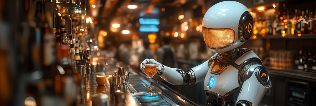 Robotic bartender mixing a drink at a stylish bar, warm ambient lighting, futuristic and sophisticated nightlife, blending technology with social interactions.