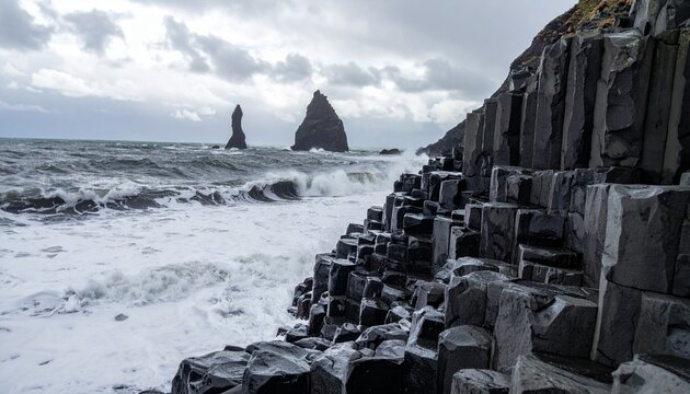 Dramatic basalt columns, crashing waves, rugged coastline under a stormy sky
