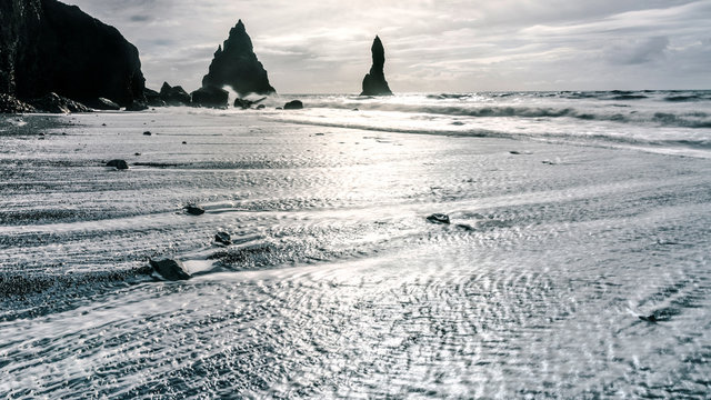 Reynisfjara Black Sand Beach with Basalt Columns and Sea Stacks Iceland