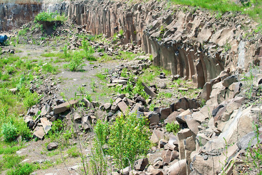 Old basalt quarry. Summer landscape with empty abandoned mining, selective focus