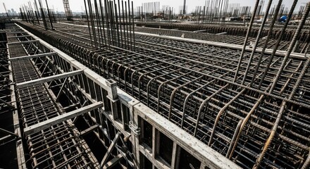 Pouring wet concrete onto steel rebar reinforcement at a construction site. Industrial cement foundation work