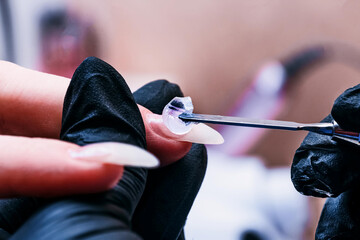 The manicure master applies a base layer of Poly-gel to the nail with a metal spatula. The brush distributes the gel over the entire surface of the nail. Close-up , selective focus