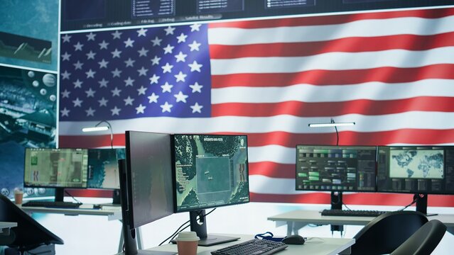 Empty modern base of operations used by the US military armed forces, safeguarding state secrets and ensuring security protocols. High tech surveillance gear used for intelligence. Camera B.