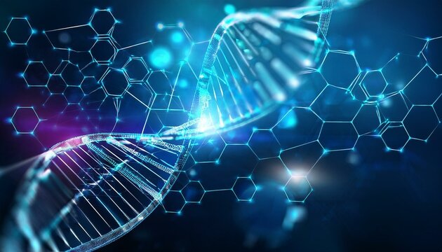 A close-up DNA double helix glows with highlighted base pairs against a blurred background.