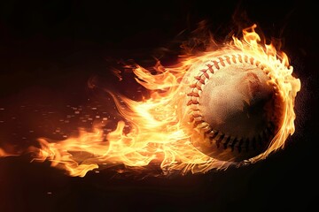 Burning baseball with bright flame flying on black background
