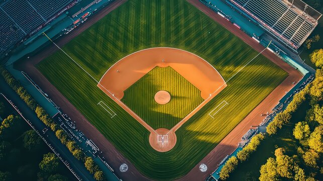 Empty baseball field with sunlit glow in morning interiors