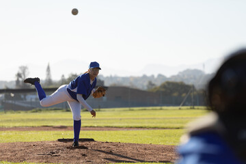 Baseball pitcher throwing on sunny day at community field