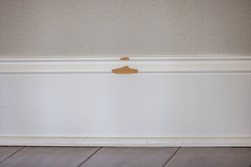 The white painted baseboard trim on a new construction house that has a broken chunk missing from the mdf material