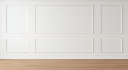 "Minimalist vector illustration of a classic interior wall with white paint and natural wood molding. Light oak flooring, baseboard trim, clean symmetrical layout, elegant and timeless room design."ar