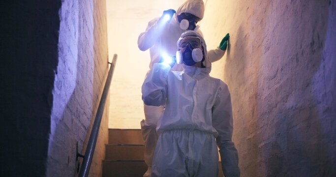Old, worn-out concrete stairs leading to a dark basement with decaying brick and plaster walls, suitable for themes of horror, abandonment