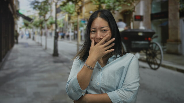 Woman laughing with hand covering mouth, bracelet visible and light blue shirt, standing near a horse carriage on a street lined with trees; shy joy.