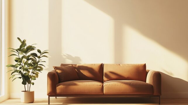 a modern living room with brown sofa and a small plant, in the style of luminous shadows, light beige, photo bashing, matte background, soft edged, modern, nature inspired.
