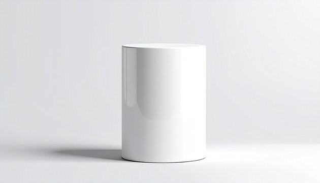 White cylinder pedestal, smooth, on white. Soft shadow below