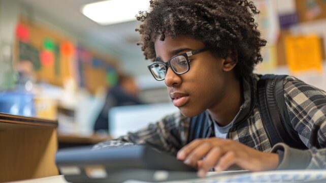 Focused boy solving math problem in classroom with books and tablet