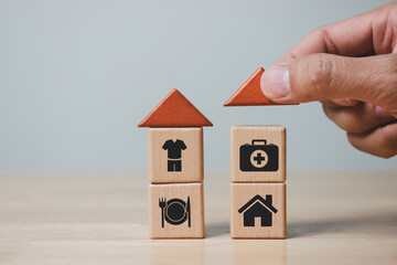 The investor's hand placed a wooden cube with word Work on wooden table. concept work from home, Planning to buy property concept ,food Clothing, housing, medicine, four basic human needs concept.