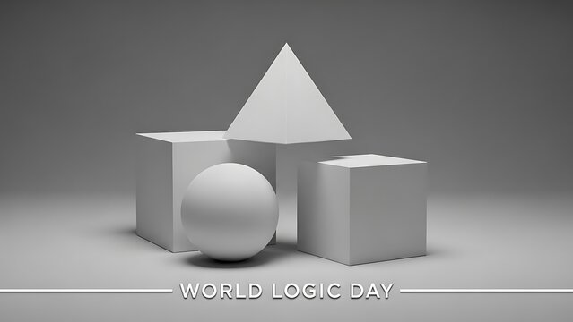 Conceptual 3D render of basic geometric shapes (sphere, cubes, pyramid) symbolizing structure and foundational logic for World Logic Day on a gray background.