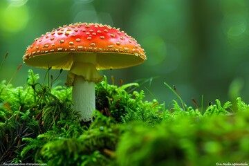 Amanita muscaria, fly agaric or fly amanita basidiomycota muscimol mushroom with typical white spots on a red hat in a forest. Natural light, vibrant colors and selective focus.