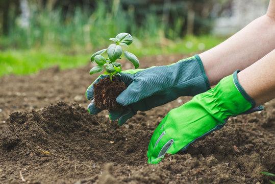 Planting in the garden, hands in gloves planting basil into flowerbed