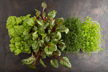 selective focus photo of basil microgreens. city farming indoor concept.