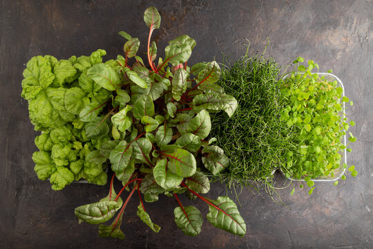 Young seedling of onion, basil, spinach growing in pot on windowsill . Gardening concept.