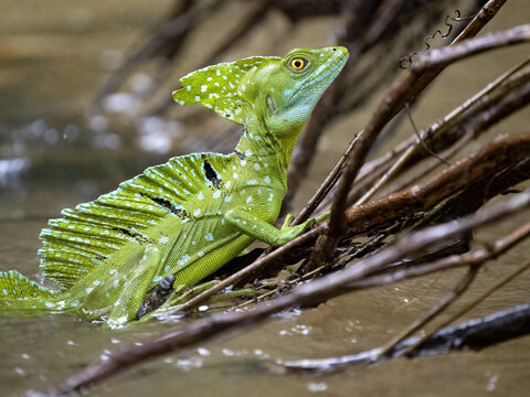 Closeup of a Green Basilisk (Basiliscus plumifrons) sitting on a trunk in the water, Costa Rica