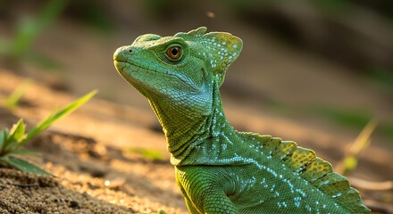 Close up of a green plumed basilisk, Basiliscus plumifrons
