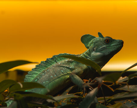 A bright green basilisk lizard rests on dark green leaves in a terrarium with a warm yellow background