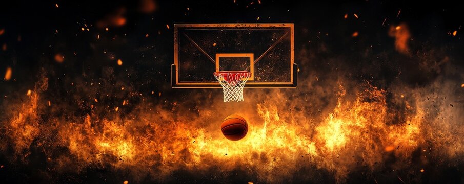 Vivid basketball hoop shot in dynamic arena lighting. Blue tones dominate the scene creating a modern aesthetic. Sports-themed stock image perfect for blog posts and promotional materials. AI
