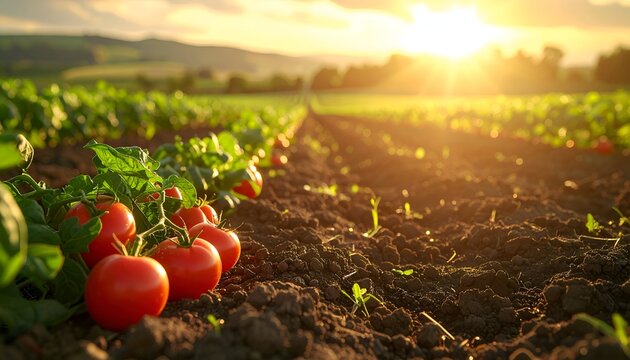 A serene landscape featuring rows of ripening red tomatoes basking in warm sunlight