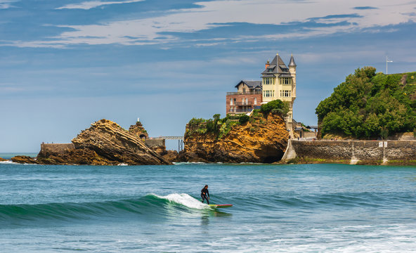 Panoramic view of Biarritz cityscape, coastline with its famous sand beaches and port for small boats. Golden hour. Aquitaine, France.