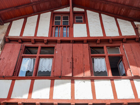 Façade typique de maison basque avec colombage rouge à Ascain, France.