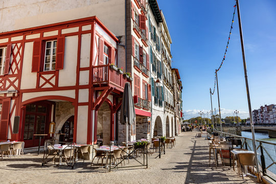 Bayonne, France - View of restaurants and the Nive of the city of Bayonne.