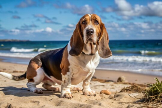 Adorable brown and white basset hound puppy leaps into air with outstretched paws and wagging tongue, capturing joyful innocence and playful energy in motion.