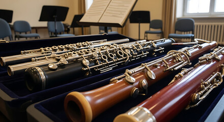 Various woodwind instruments, including oboes and bassoons, resting in their velvet-lined cases in a music room.