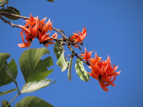 Orange Palasha Flowers Red Orange Flowers Of Bastard Teak Bengal Kino Flame Of The Forest Butea Monosperma Bloom Beautifully On The Tree On Blue Sky Background With Copy Space And Selective Focus