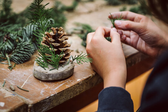 Kind, Kinderhände basteln Weihnachtsgeschenk aus Naturmaterialien, Tannenzweig, Holzscheibe und Tannenzapfen.