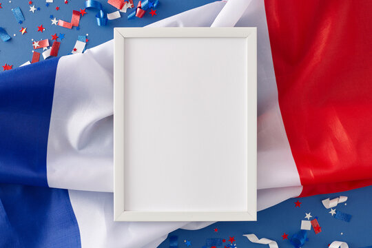 Party concept for celebration on French National Day. Top-down view of french flag, confetti, stars on blue background with blank frame for ads or text