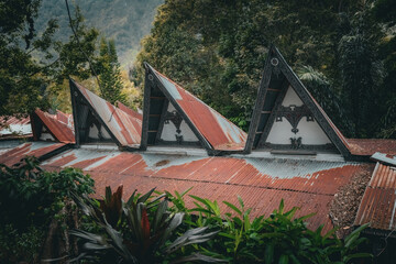 Traditional Toba batak houses with pointed roofs at Samosir island at Toba lake North Sumatra Indonesia
